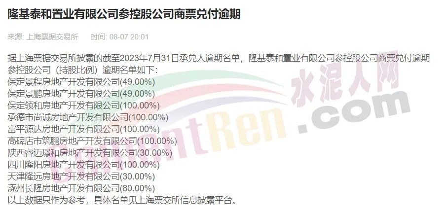 隆基泰和债务爆雷始于2021年底,旗下隆基泰和置业出现商票逾期,有10多笔商票拒付。直至今日,隆基泰和置业仍在上海票交所公布的“持续逾期名单”中。截至2023年6月30日,隆基泰和置业有限公司商票逾期5373.35万元,累计逾期发生额6300.44万元。