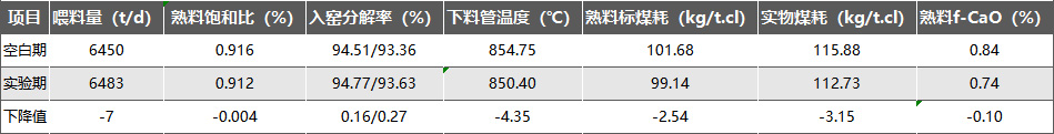空白期与试验期回转窑主要参数对比如上表所示,加入生料助磨剂后,控制窑产量、f-CaO基本不变的情况下,下调入窑生料温度控制值,入窑生料分解率仍能满足生产需求,相比空白期小幅增加,熟料实物煤耗下降3.15kg/t.cl,考虑到煤质变化影响,折算标煤耗下降约2.54kg/t.cl,节煤效果达到预期。