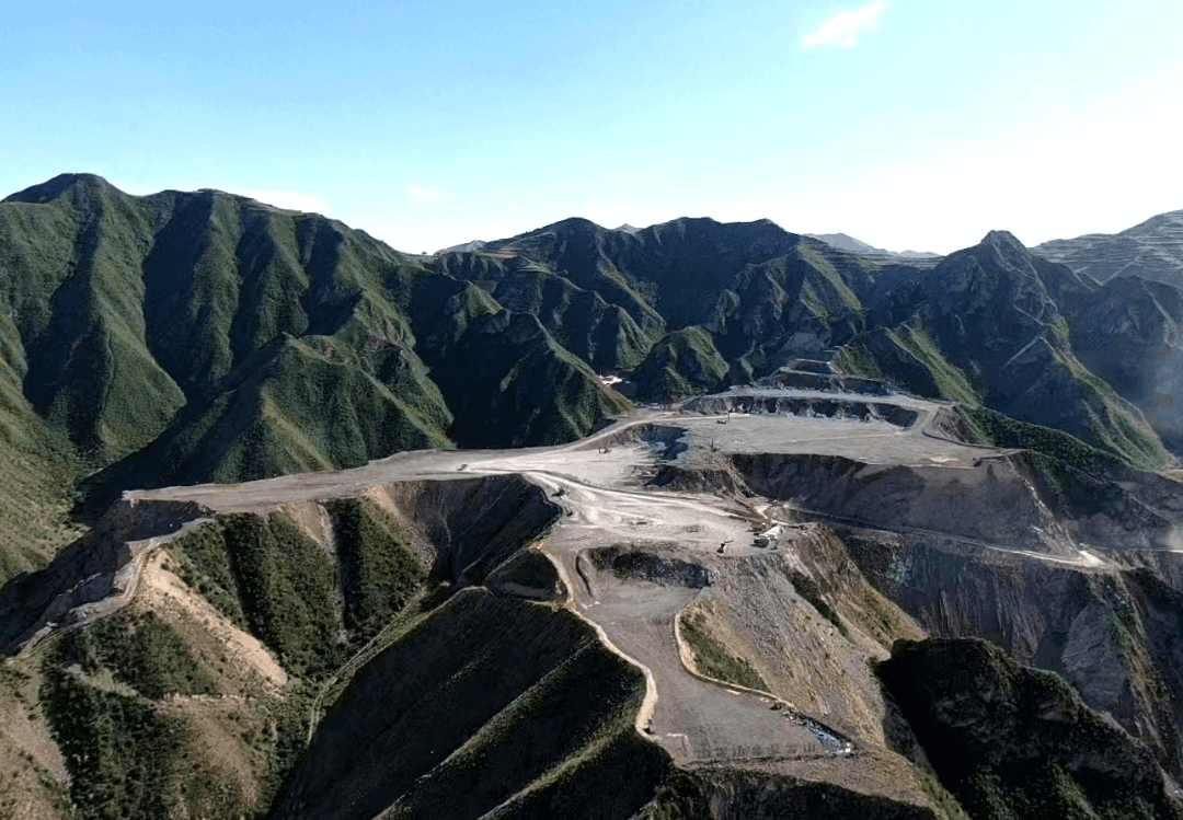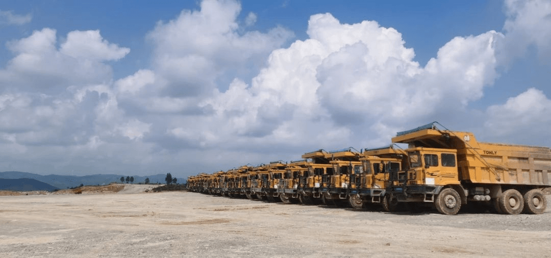 绿色矿山与蔚蓝天空,矿车阵列谱写宏伟画卷