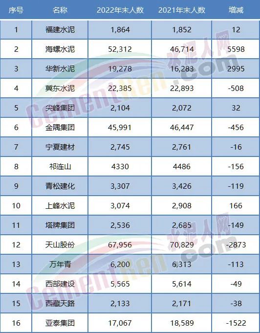 据不完全统计,从2019~2022年金隅集团、冀东水泥、亚泰集团员工都有千人以上的减员,万年青、祁连山、塔牌水泥均有百人以上的减员。2021~2022年金隅集团、冀东水泥、万年青、祁连山、塔牌集团、青松建化等均有百人以上的减员,冀东水泥减员达500多人。然而,从水泥行业未来长远的发展来看,这才是刚刚开始。