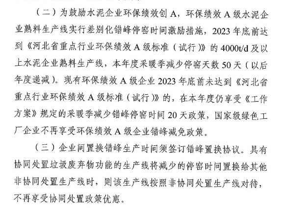 在2023年底前达A级标准的企业不仅要停窑,而且减免措施仅限拥有4000t/d及以上企业;国家级绿色工厂不再享受错峰减免政策。调整错峰生产时间和保民生的协同处置项目也必须在规定的时间段内补齐等。