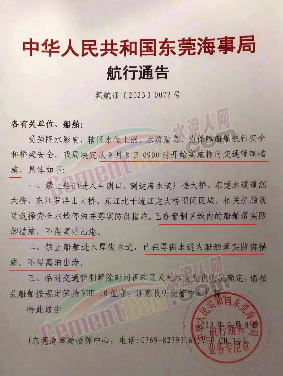 因暴雨、台风影响,华南多地大宗物流停限运,施工工地及搅拌站停工停产,水泥发运量近零。水运物流方面,海事局发布临时交通管制措施管制区内船舶禁止进入,已进入船舶不得离泊出港。