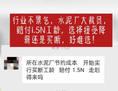 日前,某水泥企业员工反馈,所在水泥厂为节约成本,开始实行买断工龄,赔付1.5N。对于员工而言,是选择降薪留下还是买断工龄离职呢?这道选择题不仅员工难以作答,水泥企业亦没有标准答案。