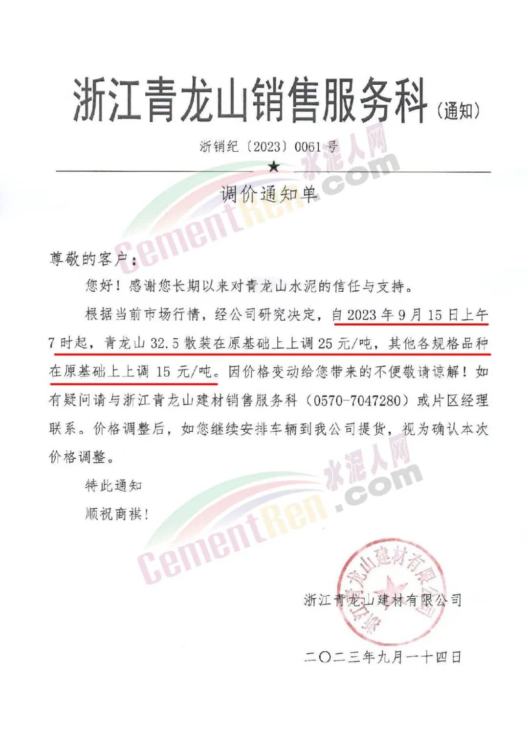 同期,红狮水泥旗下浙江青龙山销售服务科通知,根据当前市场行情,经公司研究决定,自2023年9月15日上午7时起,青龙山32.5散装在原基础上上调25元/吨,其他各规格品种在原基础上上调15元/吨。