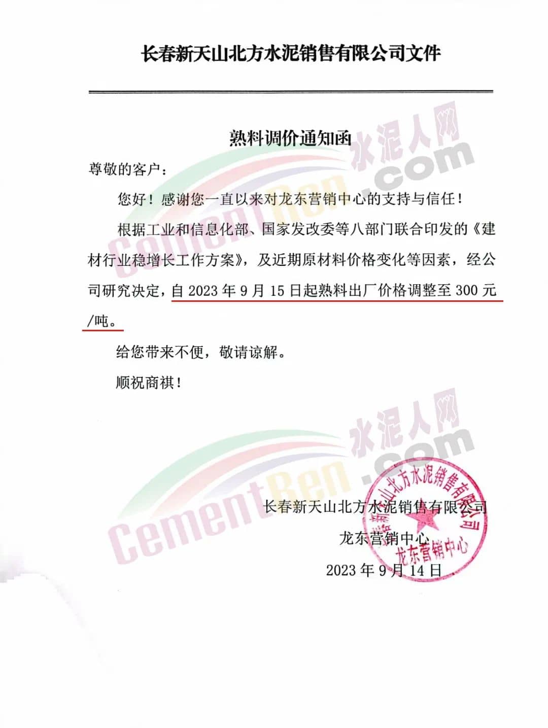 长春新天山北方水泥销售有限公司通知,自2023年9月15日起熟料出厂价格调整至300元/吨。