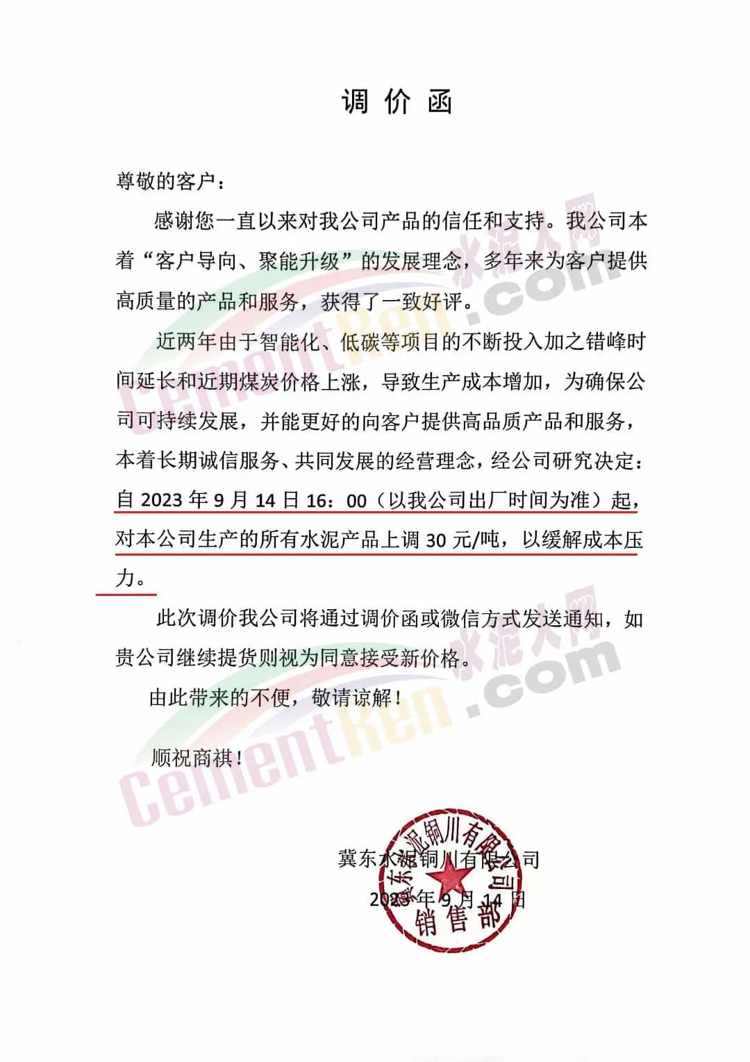 陕西冀东水泥铜川公司通知,近两年由于智能化、低碳等项目的不断投入加之错峰时间延长和近期煤炭价格上涨,导致生产成本增加,为确保公司可持续发展,并能更好的向客户提供高品质产品和服务,本着长期诚信服务、共同发展的经营理念,经公司研究决定自2023年9月14日16时起,对本公司生产的所有水泥产品上调30元/吨,以缓解成本压力。