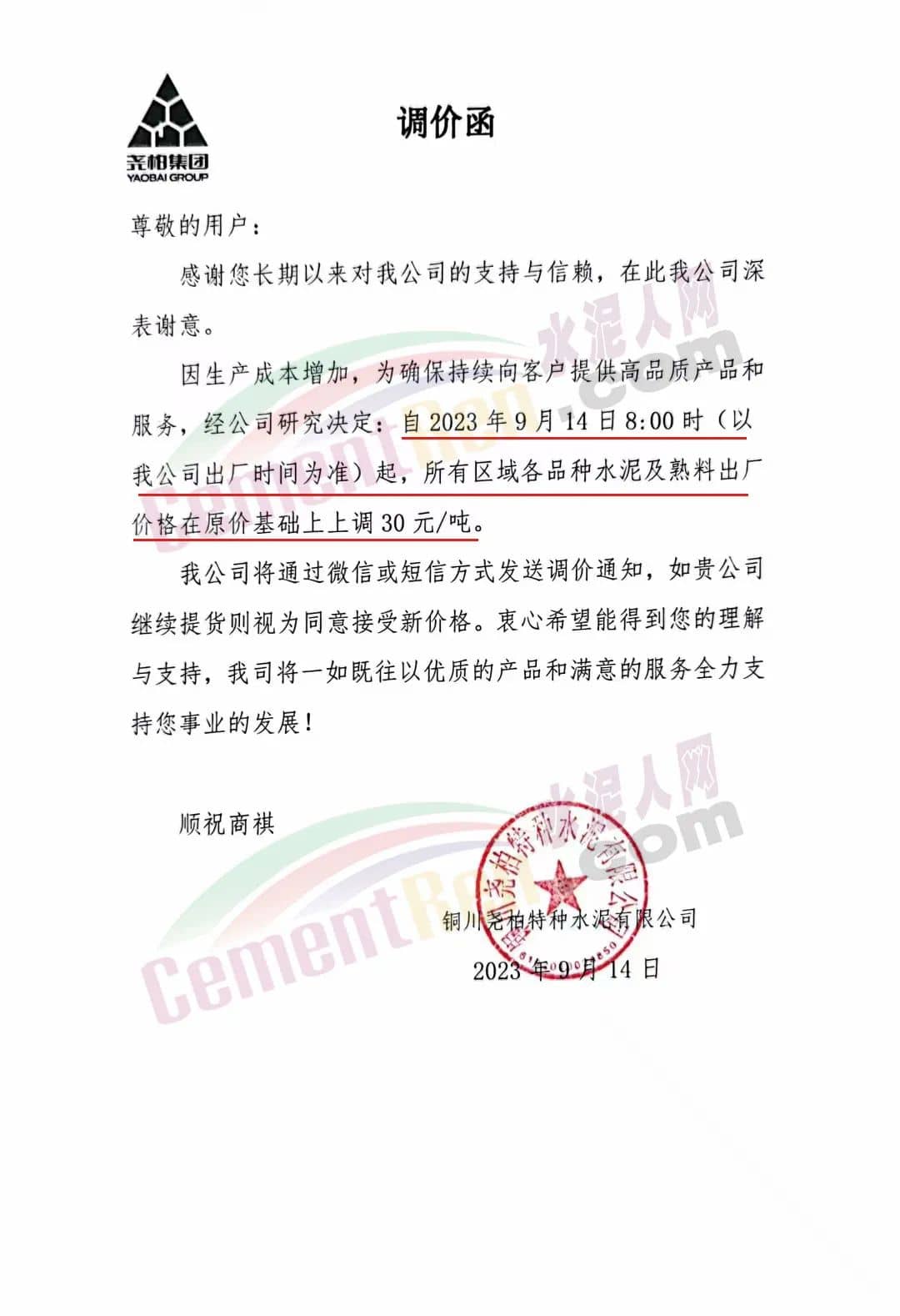铜川尧柏水泥通知自2023年9月14日8时起,所有区域各品种水泥及熟料出厂价格在原价基础上上调30元/吨。