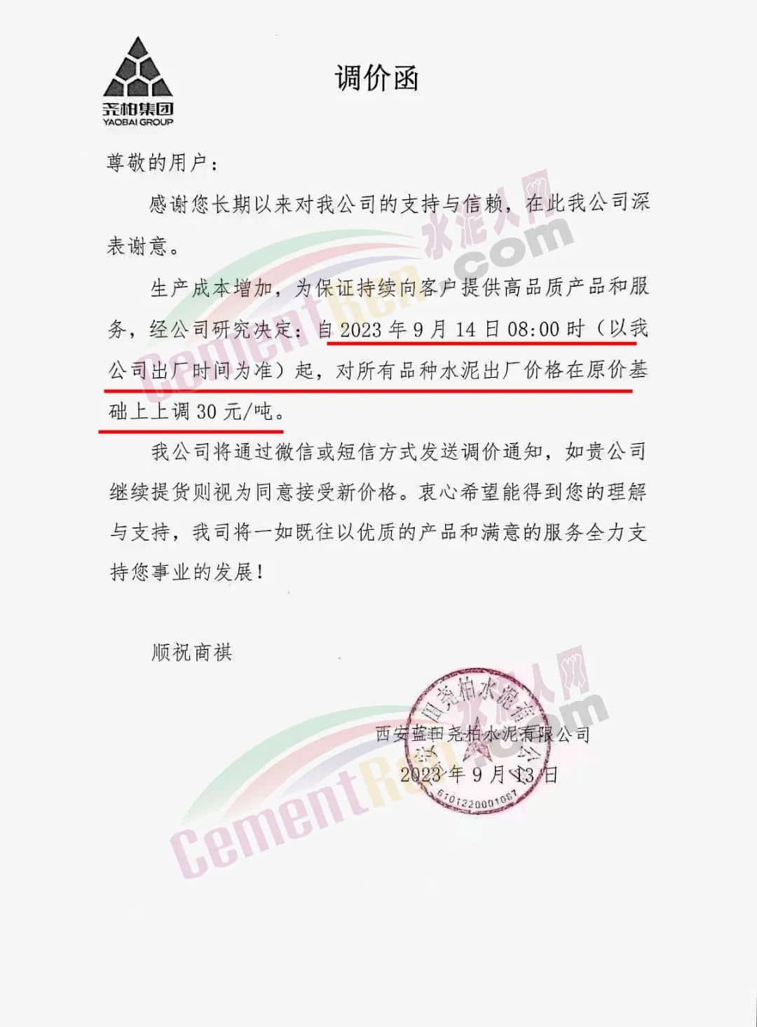 西安蓝尧柏水泥有限公司通知,生产成本增加,为保证持续向客户提供高品质产品和服务,经公司研究决定,自2023年9月14日8时起,对所有品种水泥出厂价格在原价基础上上调30元/吨。