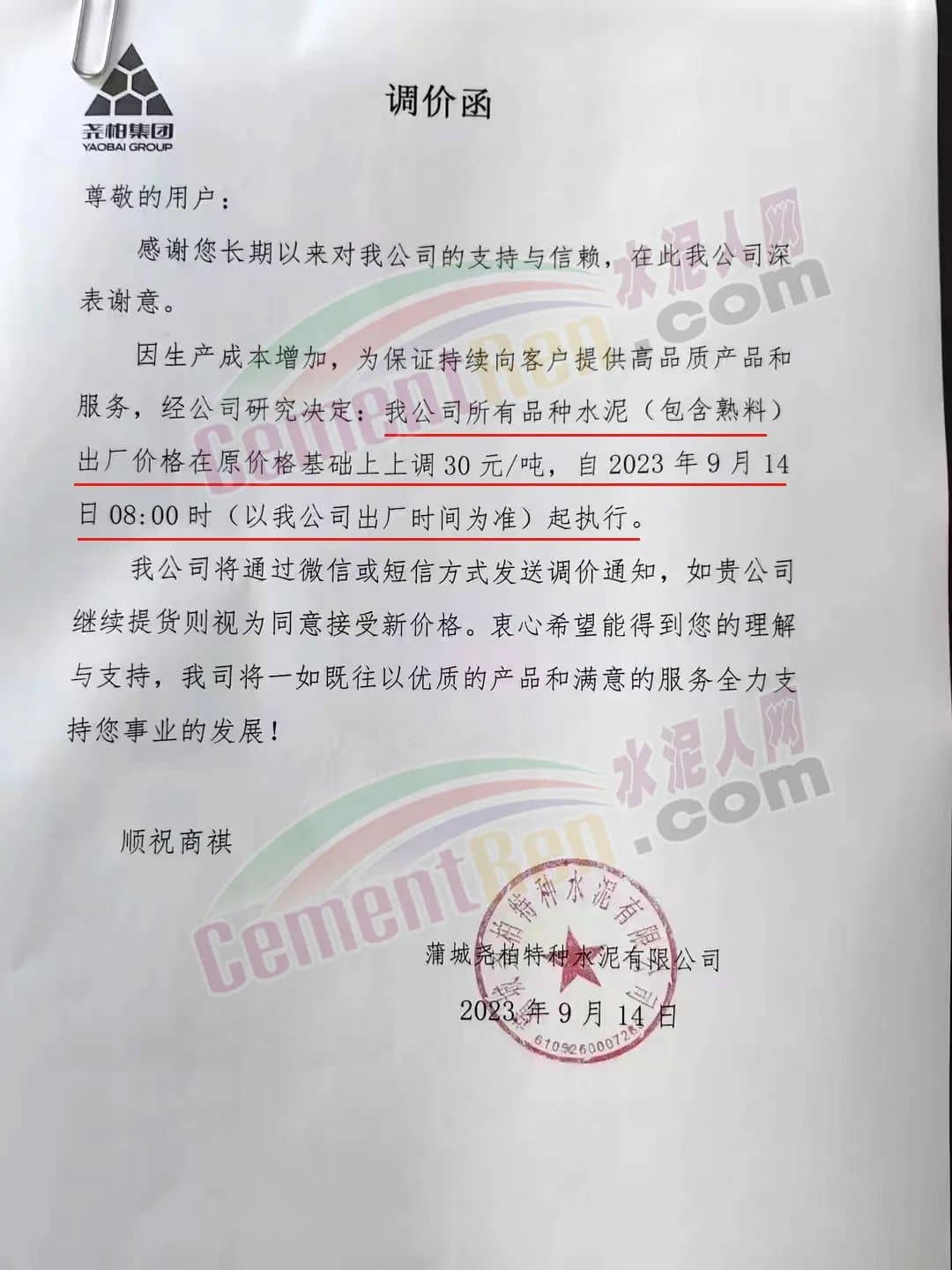 蒲城尧柏水泥通知,因生产成本增加,为保证持续向客户提供高品质产品和服务,经公司研究决定,所有品种水泥 (包含熟料)出厂价格在原价格基础上上调30元/吨,自2023 年9月14日8时起执行。