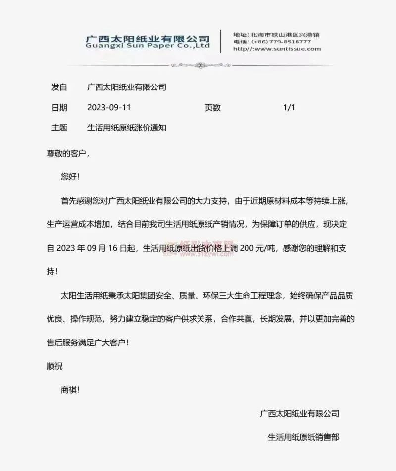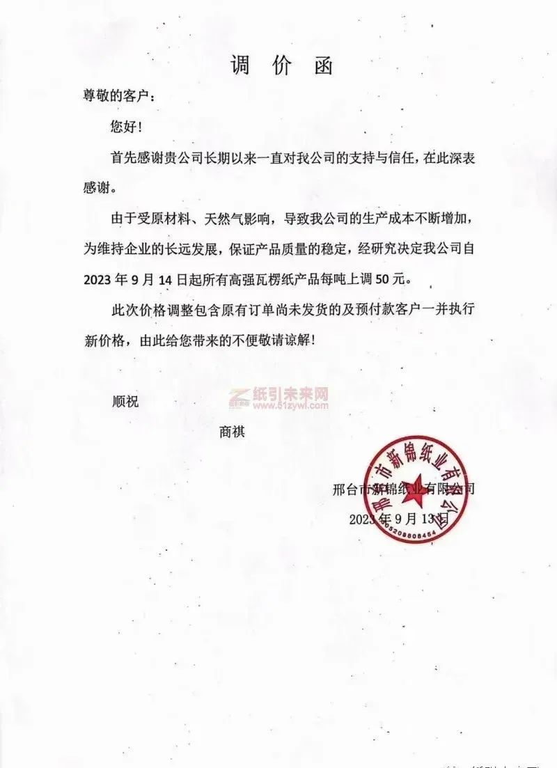 台市新锦纸业、枣庄市恒宇纸业、浙江华天再生资源、江苏富星纸业、 山东丰源中盛纸业、江苏金田纸业、山东丰硕纸业、浙江明路控股集团、河南汇祥再生资源科技、四川华侨凤凰纸业等宣布产品每吨上调50元。
