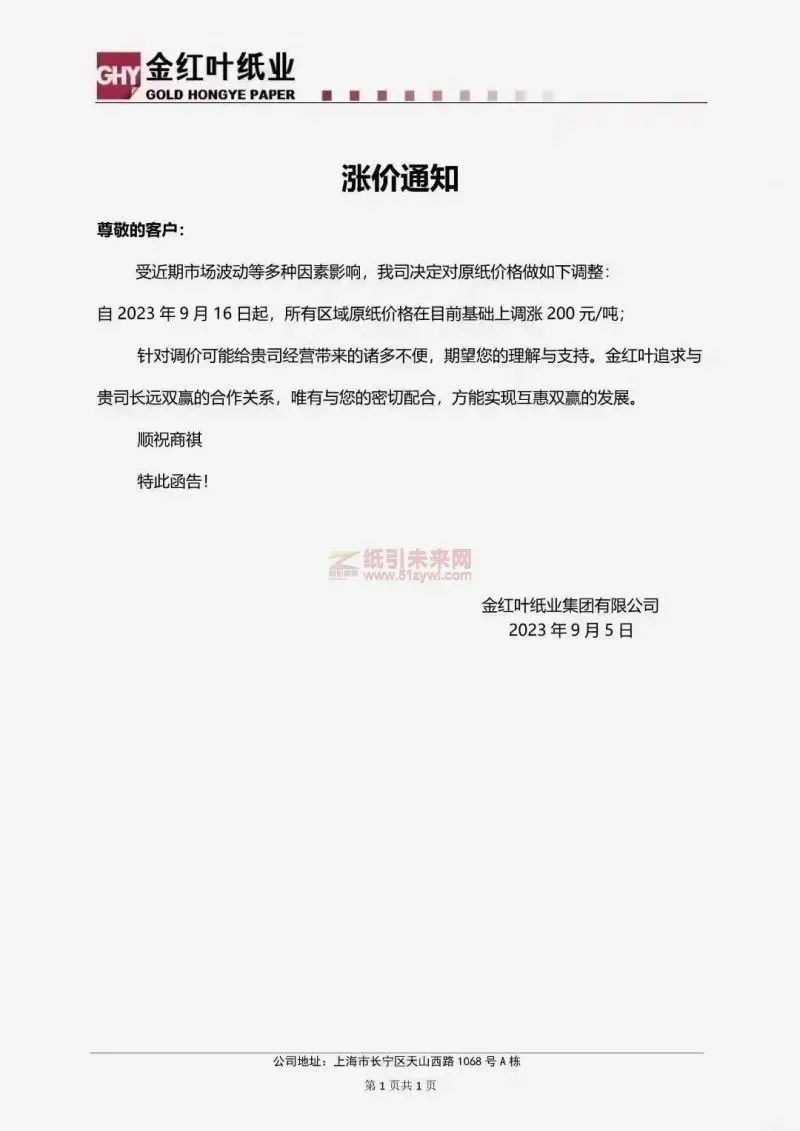 8月中下旬,废黄板纸价格止跌反弹,国内A级废黄板纸月底均价较月初上涨1.4%,之后,瓦楞纸、白卡纸、白板纸、铜版纸、双胶纸等纸种也加入涨价行列,十几家纸企也相继发布了9月的涨价函。晨鸣纸业、太阳纸业、万国纸业、玖龙纸业、博汇纸业、金光集团等多家企业均宣布提价200元/吨。