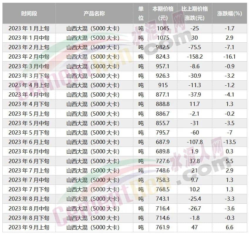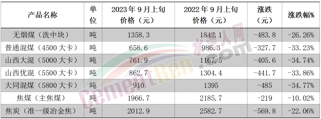 同比上年9月上旬数据,4500大卡到5800大卡煤炭价格全部为下跌,其中5800大卡煤炭下跌达485元/吨。5000大卡煤炭下跌405.6元/吨。