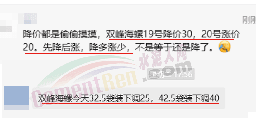 当地一经销商反馈称,“双峰海螺19日降价30元/吨,20日又通知涨价20元/吨。先降后涨,降多涨少,涨也是降啊!”