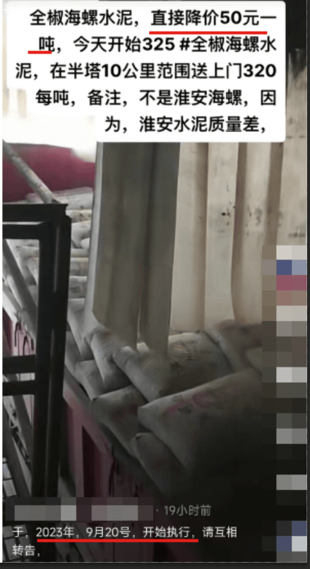 9月20日晚间,海螺水泥一经销商发消息称,“全椒海螺水泥直降50元/吨,自当日开始,32.5全椒海螺水泥在半塔10公里范围内送货上门320元/吨。并备注称,不是淮安海螺。”