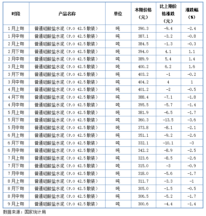 根据统计局数据显示,9月上旬33类产品较年内低点调涨,而同期水泥价格却持续下滑,连续半年创近5年低点纪录。
