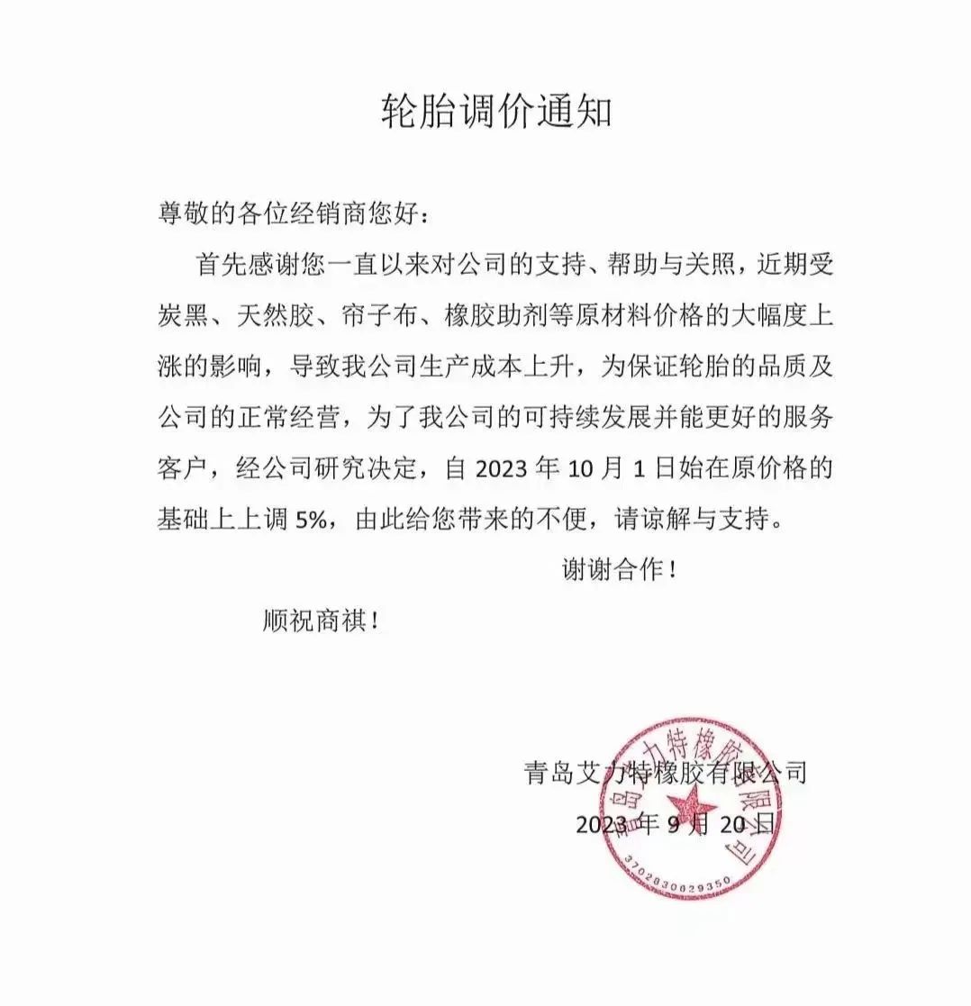 青岛艾力特:自10月1日起,将轮胎价格在原价格的基础上上调5%。