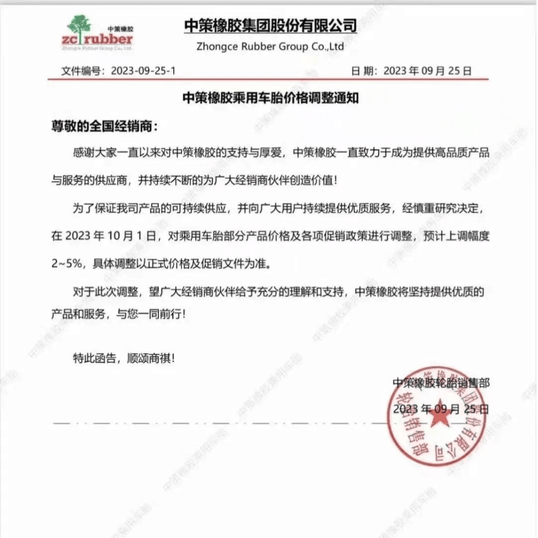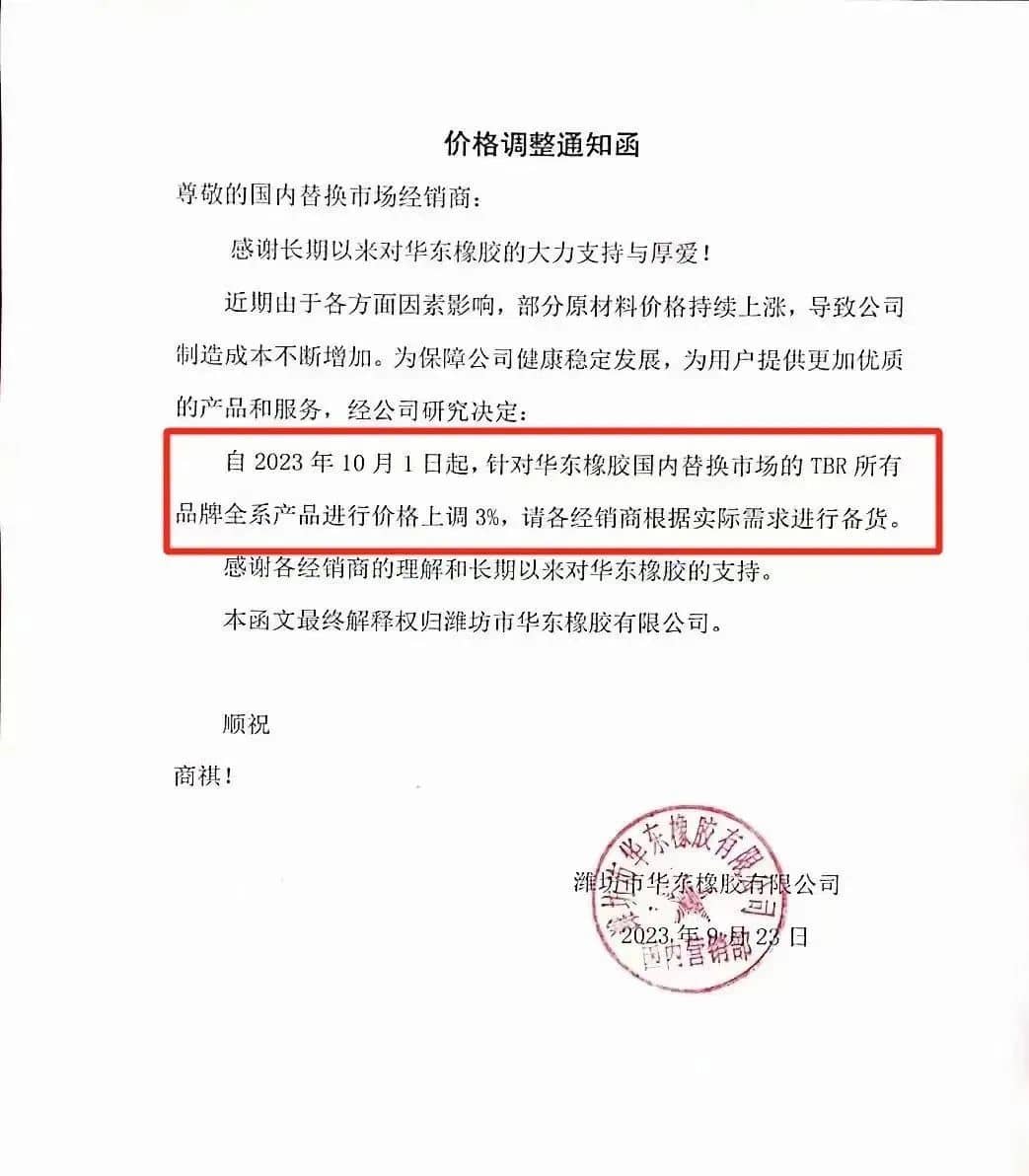 潍坊市华东橡胶:10月1日起,针对华东橡胶国内替换市场的TBR所有品牌全系产品进行价格上调3%。