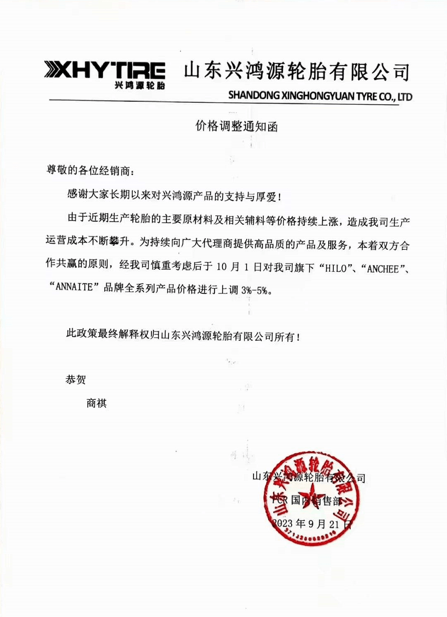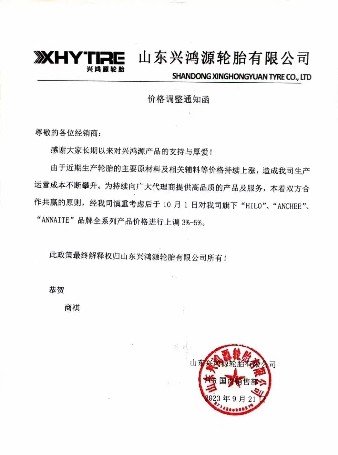 山东兴鸿源轮胎:10月1日起,将对旗下“HILO”“ANCHEE”“ANNAITE”品牌全系列产品价格进行上调3%—5%。