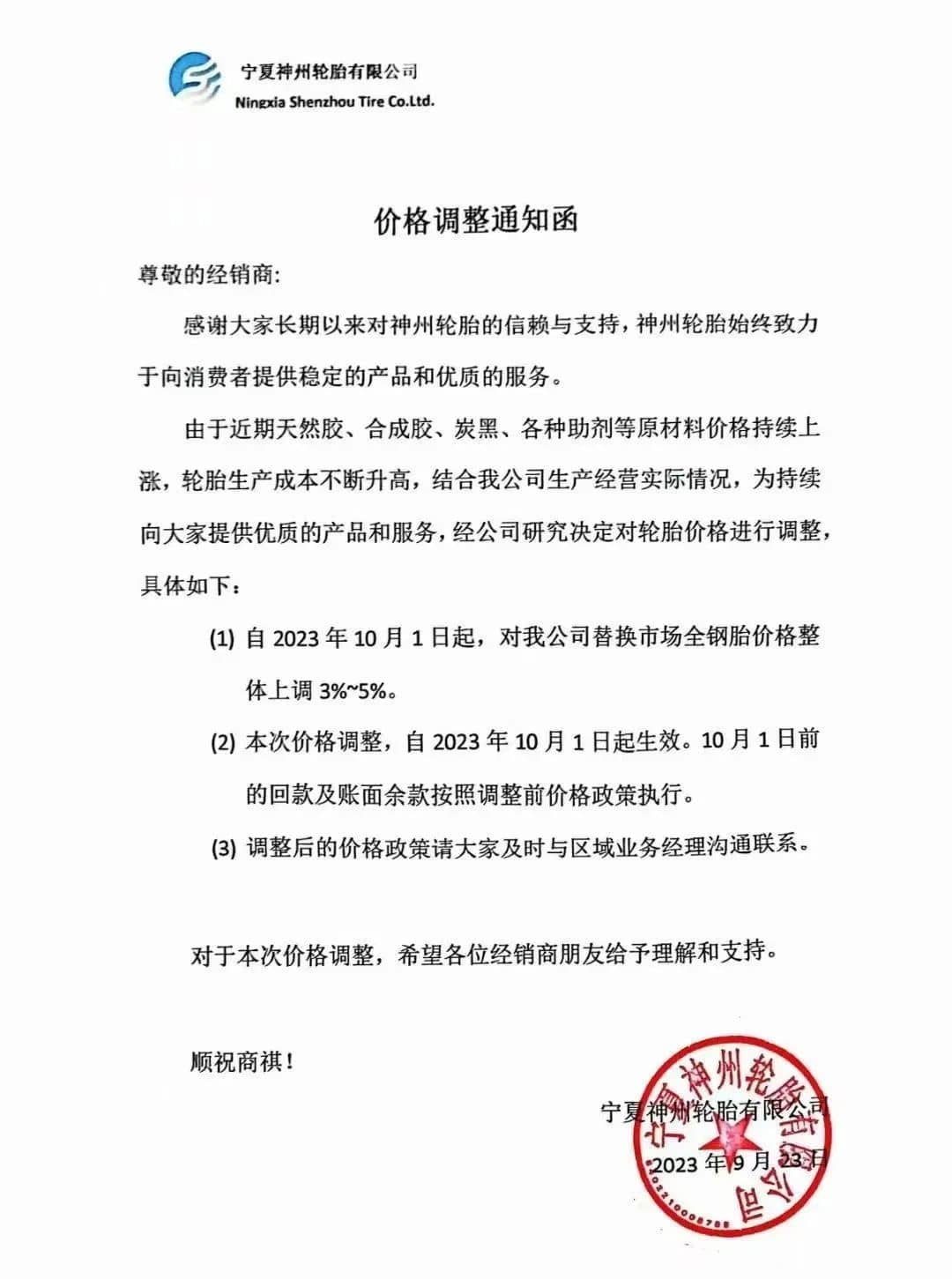 宁夏神州轮胎:自10月1日起,对替换市场全钢胎价格整体上调3%—5%。