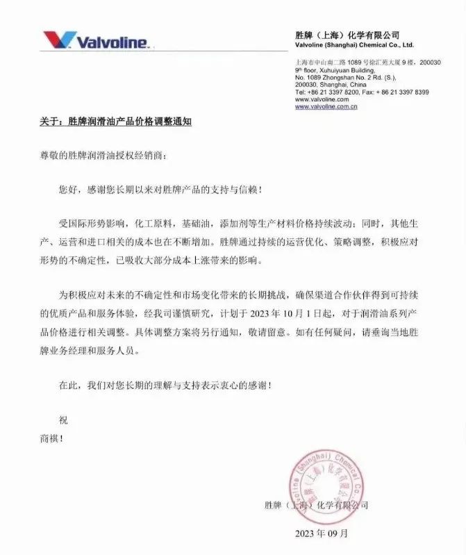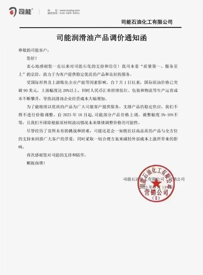 司能润滑油:自10月起,能部分产品价格上调5%—10%不等。