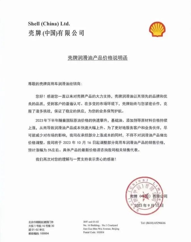 壳牌中国:10月16日起,调整部分商用车润滑油售价,预计涨幅5%左右。