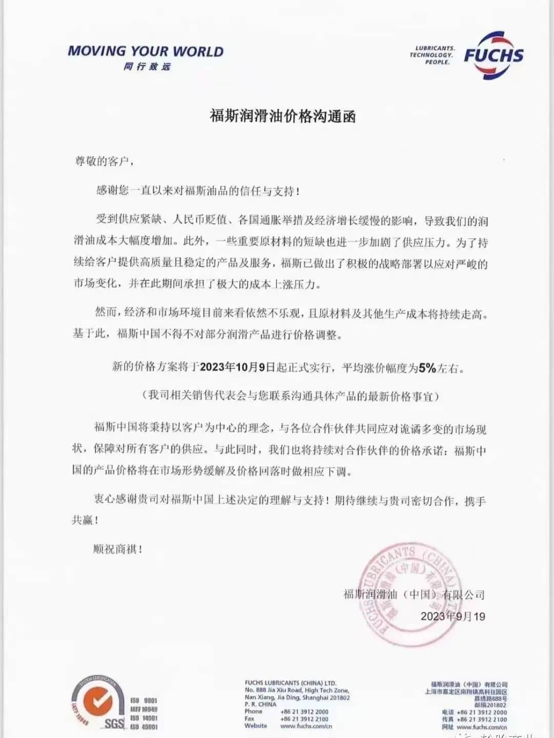 福斯润滑油:10月9日起实施新价格,平均涨幅5%左右。