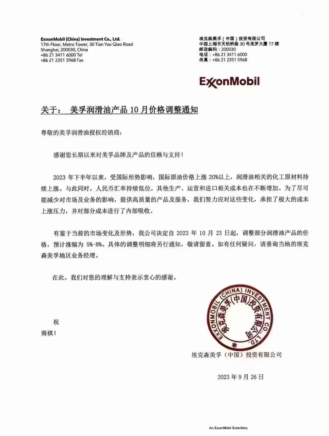 埃克森美孚:自10月23日起,调整部分润滑油产品的价格,预计涨幅为5%—8%。