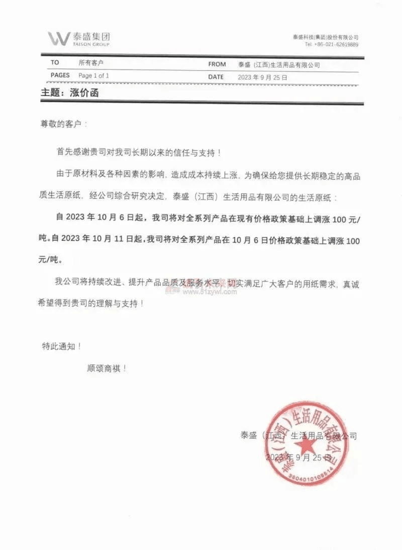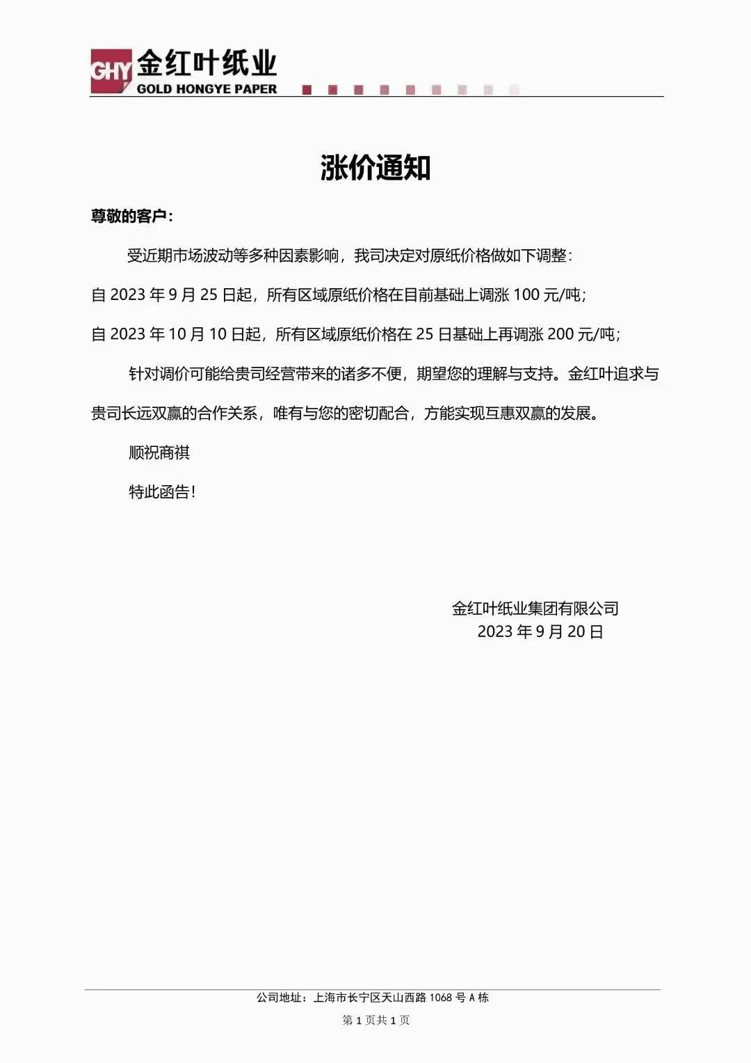 金红叶纸业:受近期市场波动等多种因素影响,我司决定对原纸价格做如下调整自2023年9月25日起所有区域原纸价格在目前基础上调涨100元/吨,自2023年10月10日起所有区域原纸价格在25日基础上再调涨200元/吨。