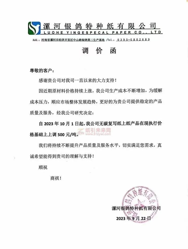 漯河银鸽特种纸:自10月1日起无碳复写纸上纸产品在执行价格基础上上调500元/吨。