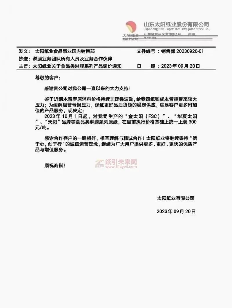 山东太阳纸业:10月1日起,对“金太阳(FSC)”华夏太阳“天阳”品牌等食品类淋膜系列原纸,在目前执行价格基础上统一上调300元/吨。