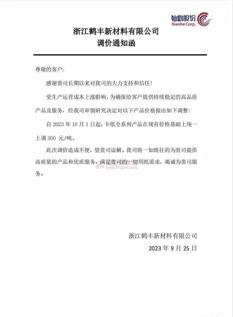 浙江鹤丰新材料:自10月1日起,卡纸全系列产品在现有价格基础上统一上调300元/吨。