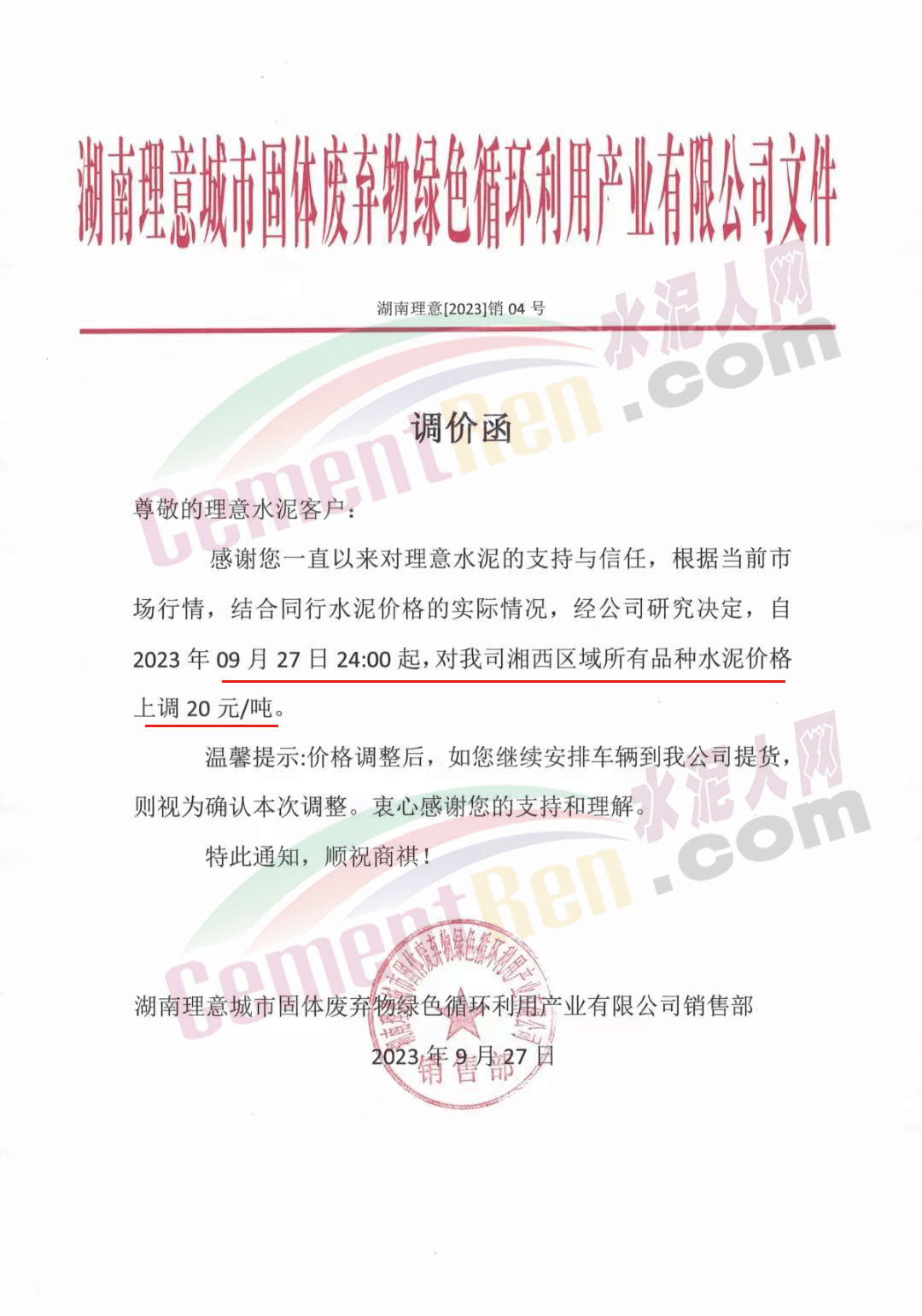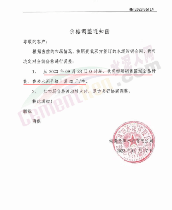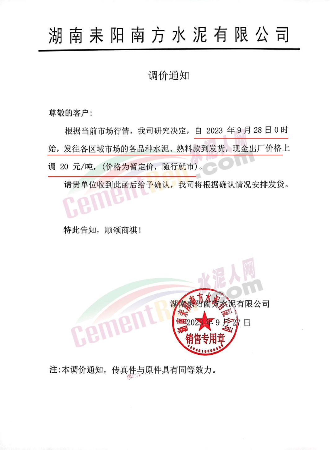 9月27日~28日,湖南省内主要品牌企业通知上调水泥报价,9月份内已连续2—3次上调报价。当地主要品牌企业负责人表示,目前各企业库位较低,叠加下游经销商备货意愿强烈,主要品牌企业门前开始排队。预计本轮全区域普涨,要到10月中旬前后落实到位。同时为提升盈利,当地主要品牌企业10月份仍将继续推动价格上调。
