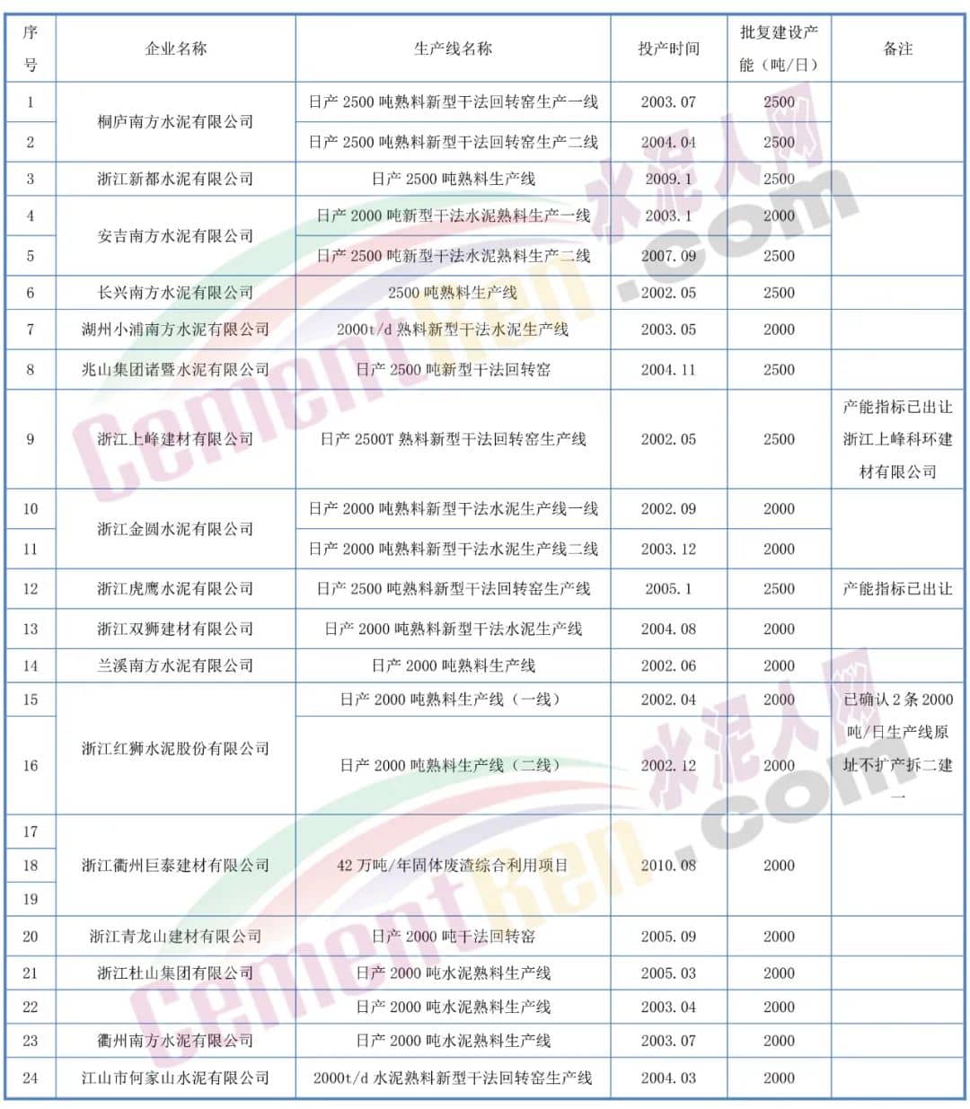 浙江红狮水泥股份有限公司已确认两条2000t/d生产线原址不扩产拆二建一;浙江上峰建材有限公司日产2500吨熟料新型干法回转窑生产线产能指标已出让浙江上峰科环建材有限公司;浙江虎鹰水泥有限公司,日产2500吨熟料新型干法回转窑生产线产能指标已出让。