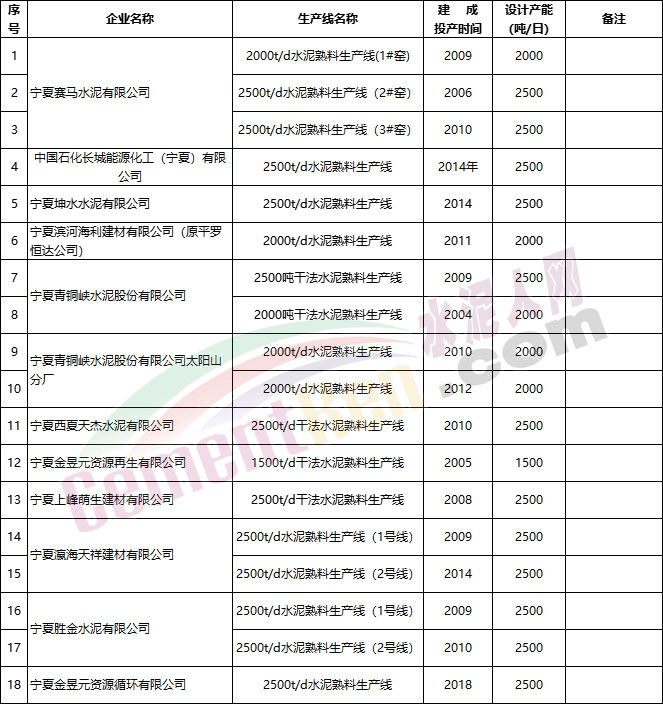 根据宁夏工信厅发布的水泥熟料生产线清单,除三条长期停产的特种水泥生产线外共有6条2000t/d及以下熟料生产线,其中包括5条2000t/d熟料生产线和1条1500t/d熟料生产线;共12条2500t/d熟料生产线。