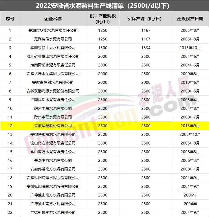 《浙江省水泥工业高质量发展暨碳达峰行动计划(2022~2025年)》文件要求,研究落实2500t/d及以下水泥熟料生产线整合退出方案,省市县合力分年度推进。2025年底前完成8条2500t/d及以下熟料生产线减量置换、兼并重组和原厂址拆建。浙江工信厅公布截至2022年底熟料生产线清单显示: