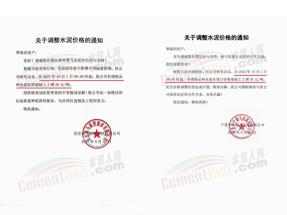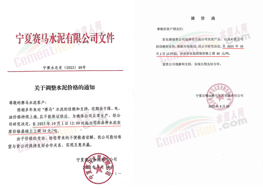 10月1日,宁夏赛马水泥、宁夏吴忠赛马,宁夏中卫赛马、宁夏石嘴山赛马等企业陆续通知,各规格品种水泥在原基础上上调30元/吨。