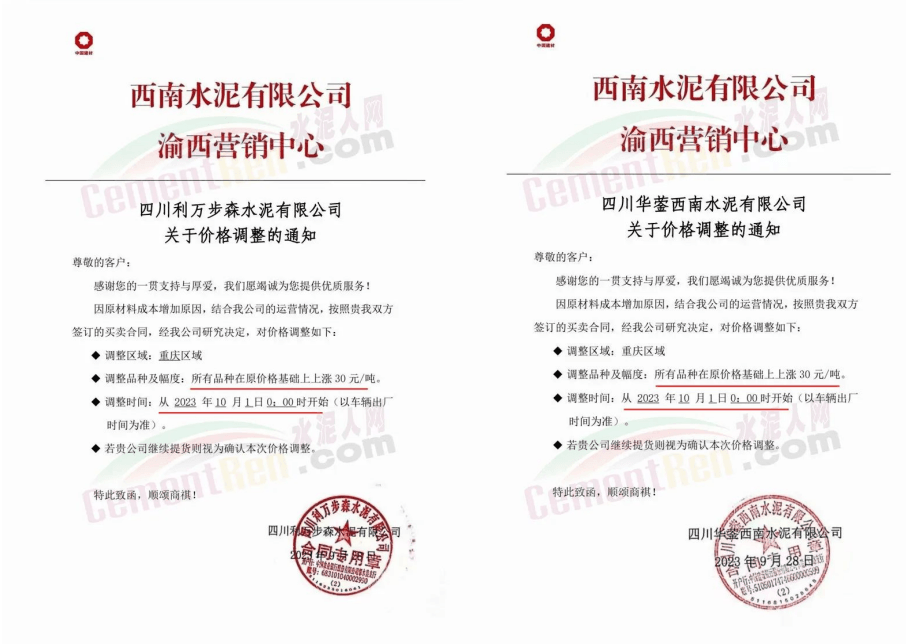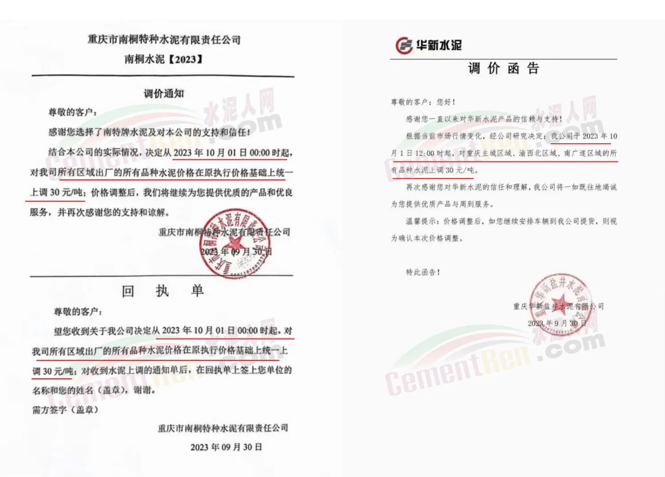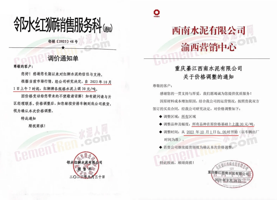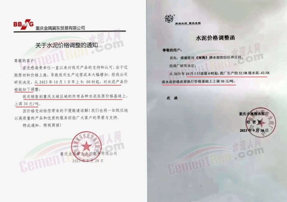 10月1日重庆金隅冀东、华新水泥、红狮水泥、西南水泥渝西营销中心等主要品牌企业通知,上调水泥价格30元/吨。