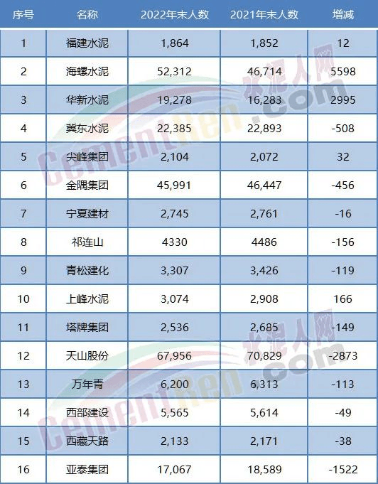 据上市企业公开数据,从2019~2022年金隅集团、冀东水泥、亚泰集团员工都有千人以上的减员,万年青、祁连山、塔牌水泥均有百人以上的减员。2021~2022年金隅集团、冀东水泥、万年青、祁连山、塔牌集团、青松建化等均有百人以上的减员,冀东水泥减员达500多人。然而,从水泥行业未来发展来看,这才是刚刚开始。