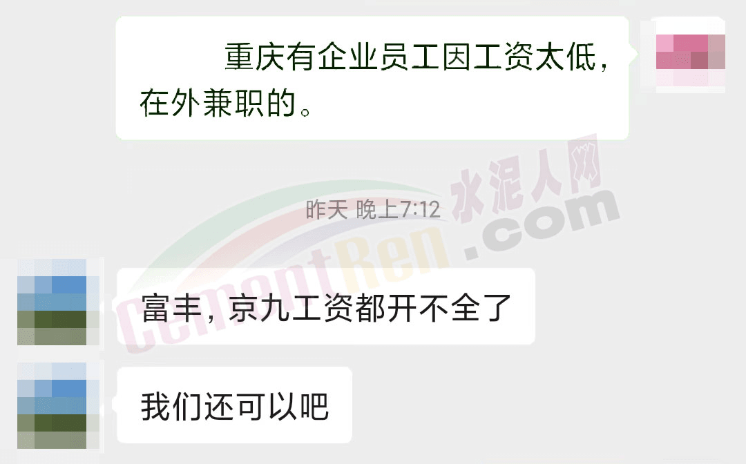 重庆某水泥企业工会负责人表示:富丰、京九工资都开不全了。