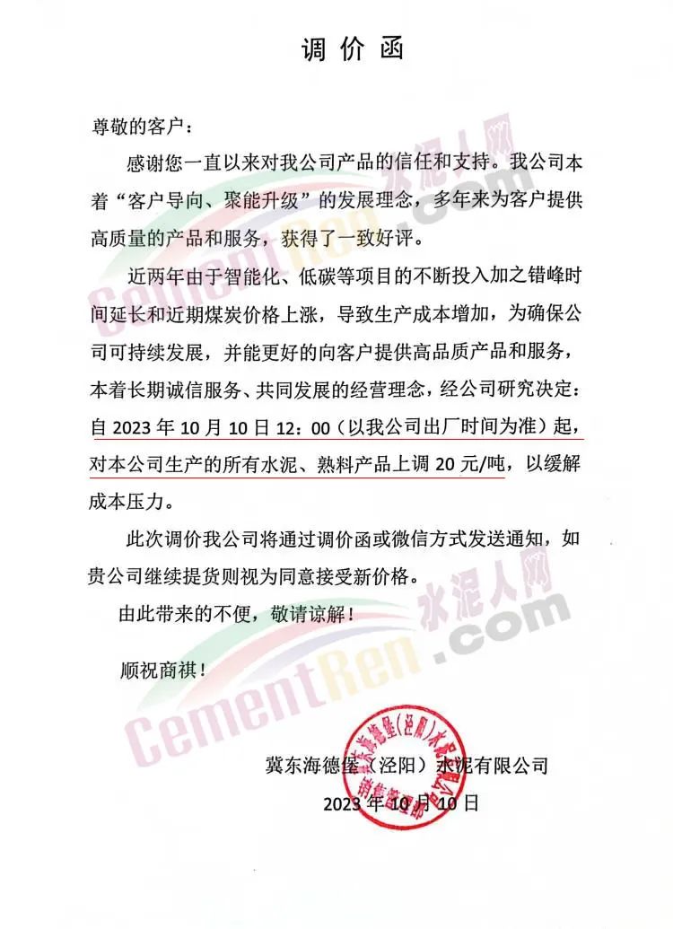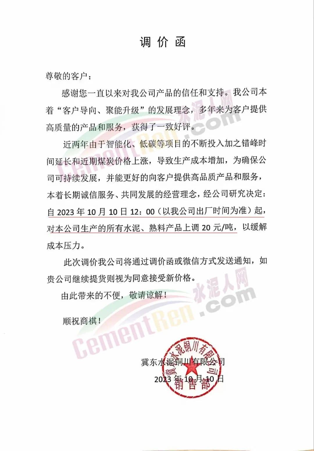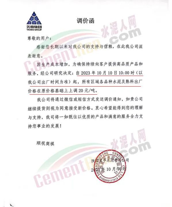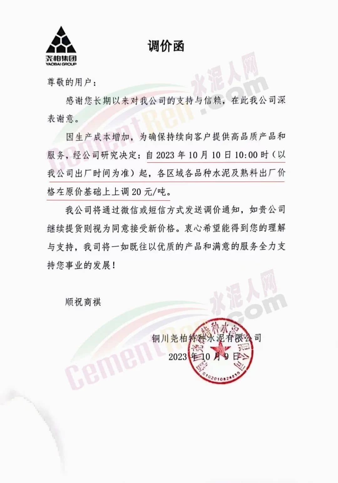 尧柏集团旗下铜川尧柏特种水泥有限公司、陕西富平水泥有限公司通知,因生产成本增加,为确保持续向客户提供高品质产品和服务,经公司研究决定,自2023年10月10日10时起,所有区域各品种水泥及熟料出厂价格在原价格基础上上调20元/吨。