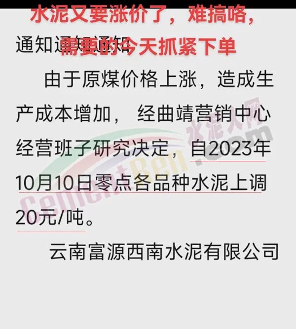 云南富源西南水泥有限公司通知,由于原煤价格上涨,造成生产成本增加,经曲靖营销中心经营班子研究决定,自2023年10月10日零点各品种水泥上调20元/吨。