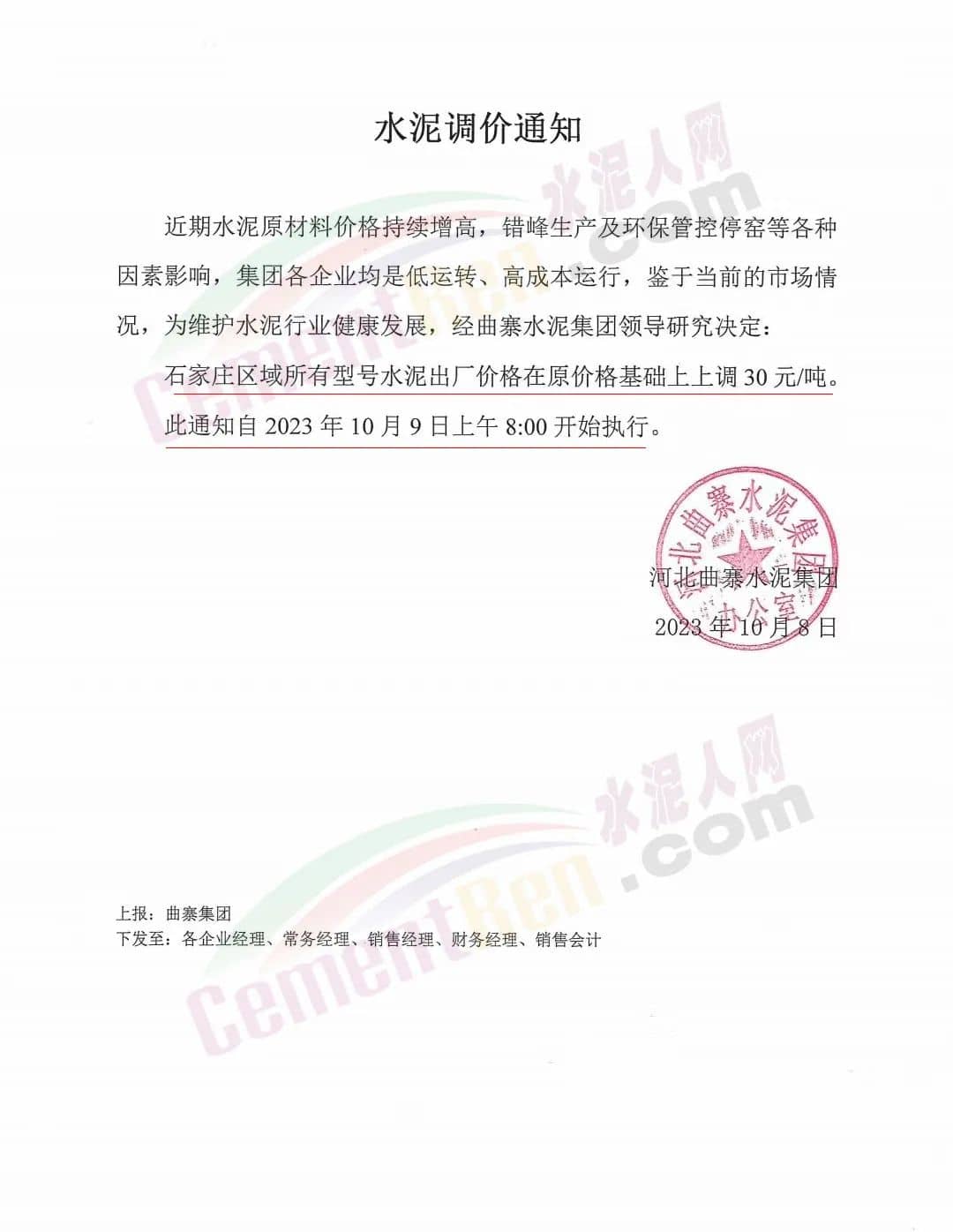 河北曲寨水泥集团通知,近期水泥原材料价格持续增高,错峰生产及环保管控停窑等各种因素影响,集团各企业均是低运转、高成本运行,鉴于当前的市场情况,为维护水泥行业健康发展,经曲寨水泥集团领导研究决定,自2023年10月9日上午8时起,石家庄区域所有型号水泥出厂价格在原价格基础上上调30元/吨。