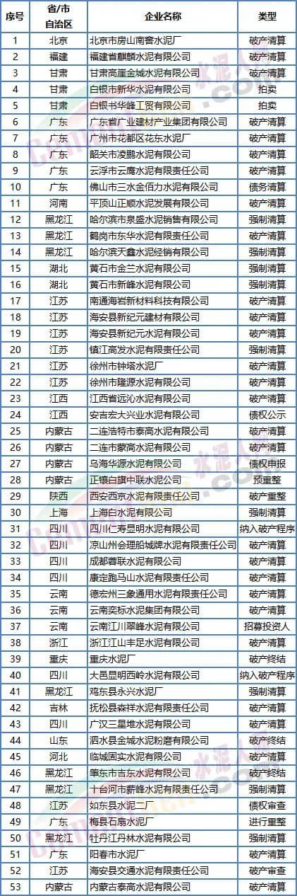 水泥人网注意到,近两个月以来公布相关消息的水泥企业中,有的企业破产后欠付员工社保;有的企业员工成为企业债权人;有的因欠供应商货款被申请破产清算;还有的连累兄弟企业与其一起破产……