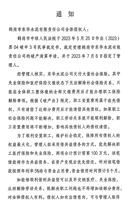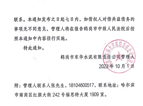 鹤岗市中级人民法院已于今年5月裁定受理鹤岗市东华水泥有限责任公司的破产清算申请,并于2023年7月6日指定了管理人。