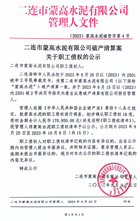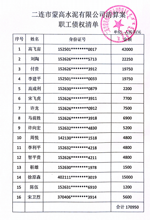 二连市蒙高水泥有限公司破产,管理人初步确认职工债权16笔债权金额合计人民币170,950.00元。