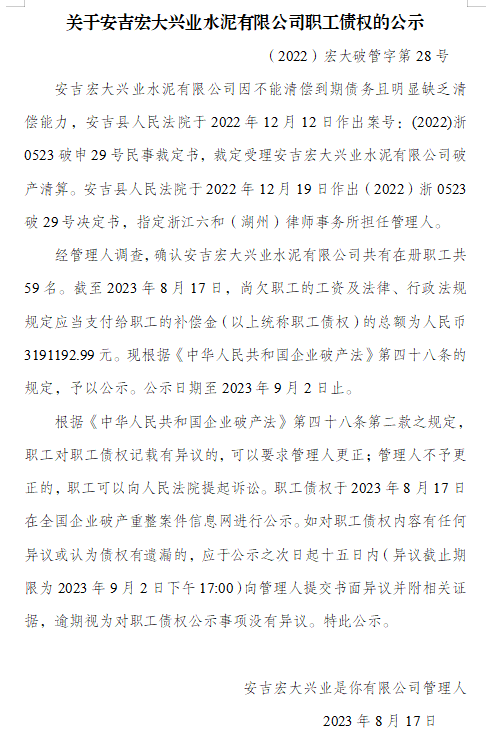 8月17日,安吉宏大兴业水泥有限公司管理人发公示消息称,经调查确认安吉宏大兴业水泥有限公司共有在册职工共59名。截至2023年8月17日,尚欠职工的工资及法律、行政法规规定应当支付给职工的补偿金(以上统称职工债权)的总额为人民币3191192.99元。