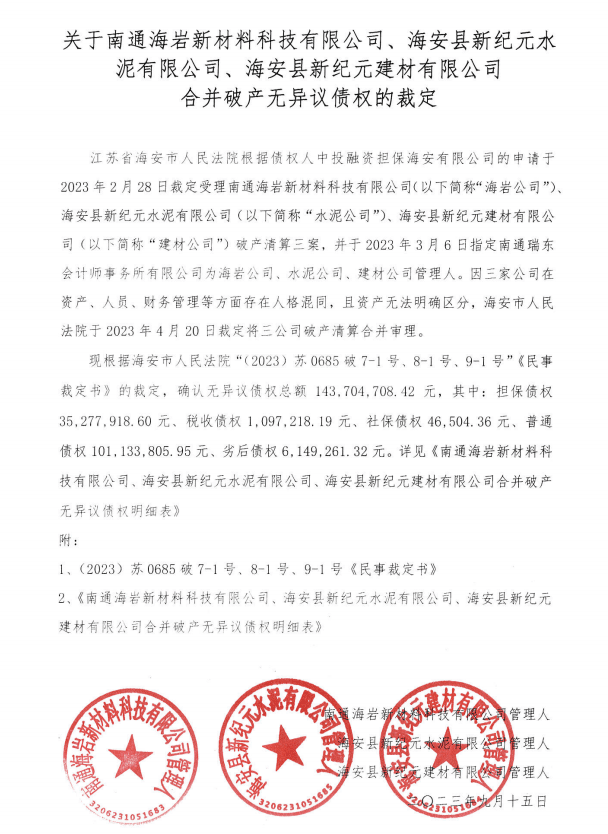 江苏省海安市人民法院根据债权人中投融资担保海安有限公司的申请,于2023年2月28日裁定受理南通海岩新材料科技有限公司、海安县新纪元水泥有限公司、海安县新纪元建材有限公司破产清算三案,并于2023年3月6日指定南通瑞东会计师事务所有限公司为海岩公司、新纪元水泥公司、建材公司管理人。因三家公司在资产、人员、财务管理等方面存在人格混同,且资产无法明确区分,海安市人民法院于2023年4月20日裁定将三公司破产清算合并审理。