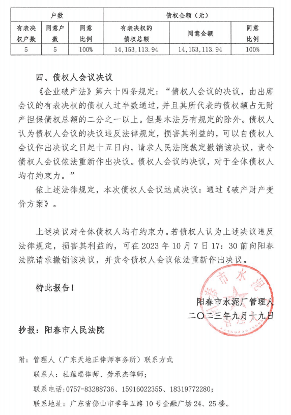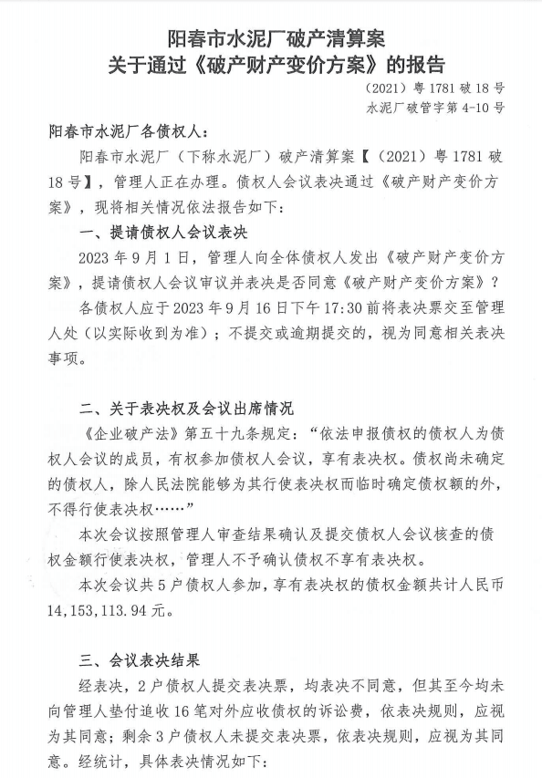 阳春市水泥厂破产清算,债务人3:2通过《破产财产变价方案》的报告