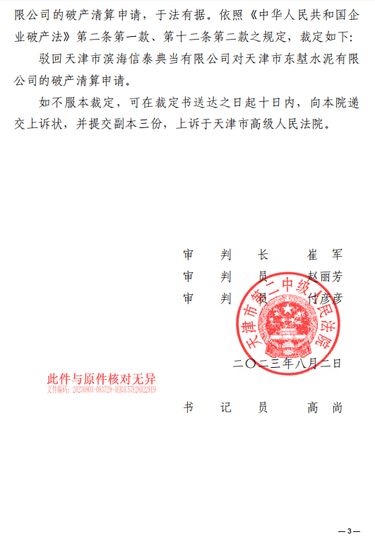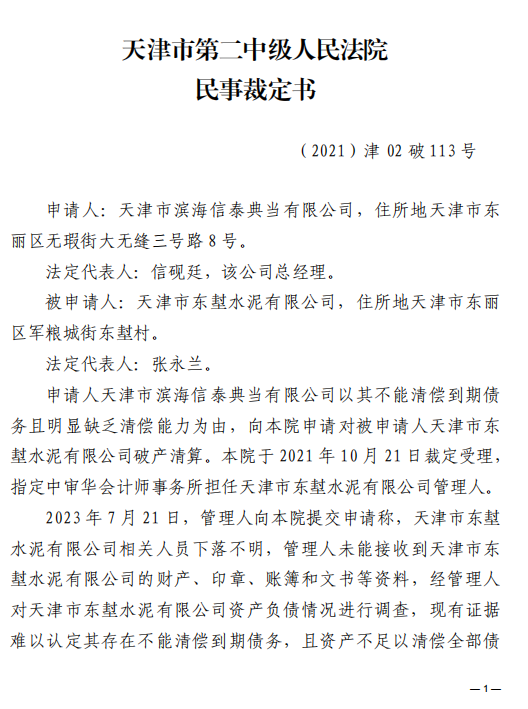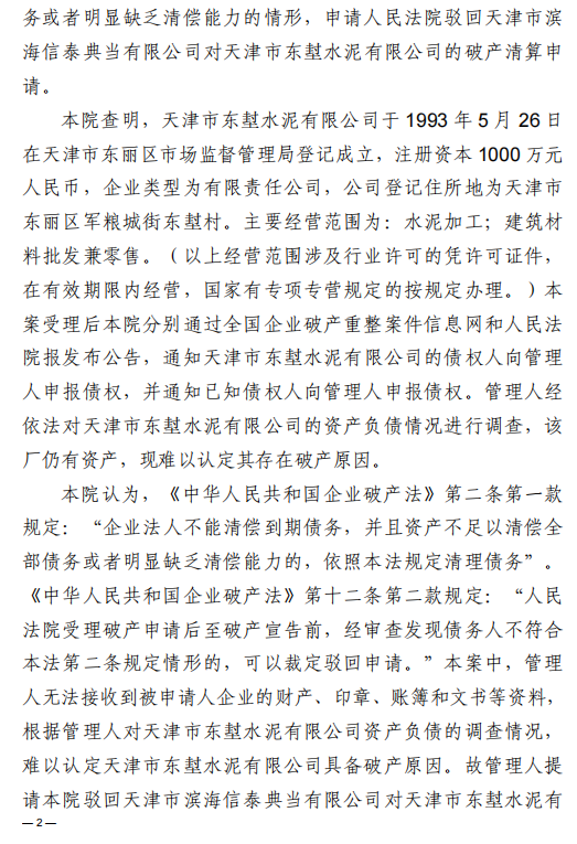2023年7月21日,管理人向天津市第二中级人民法院提交申请称,天津市东堼水泥有限公司相关人员下落不明,管理人未能接收到天津市东堼水泥有限公司的财产、印章、账簿和文书等资料,经管理人依法对天津市东堼水泥有限公司的资产负债情况进行调查,该厂仍有资产,现难以认定其存在破产原因。法院于8月2日裁定驳回天津市滨海信泰典当有限公司对天津市东堼水泥有限公司的破产清算申请。