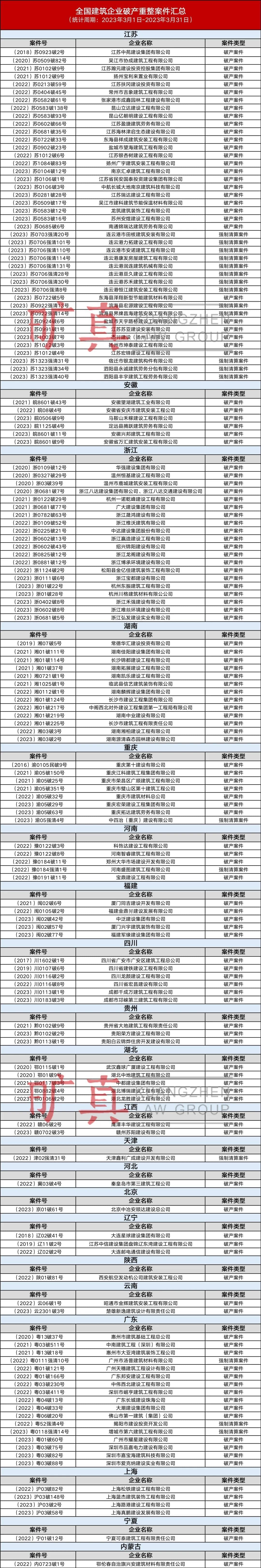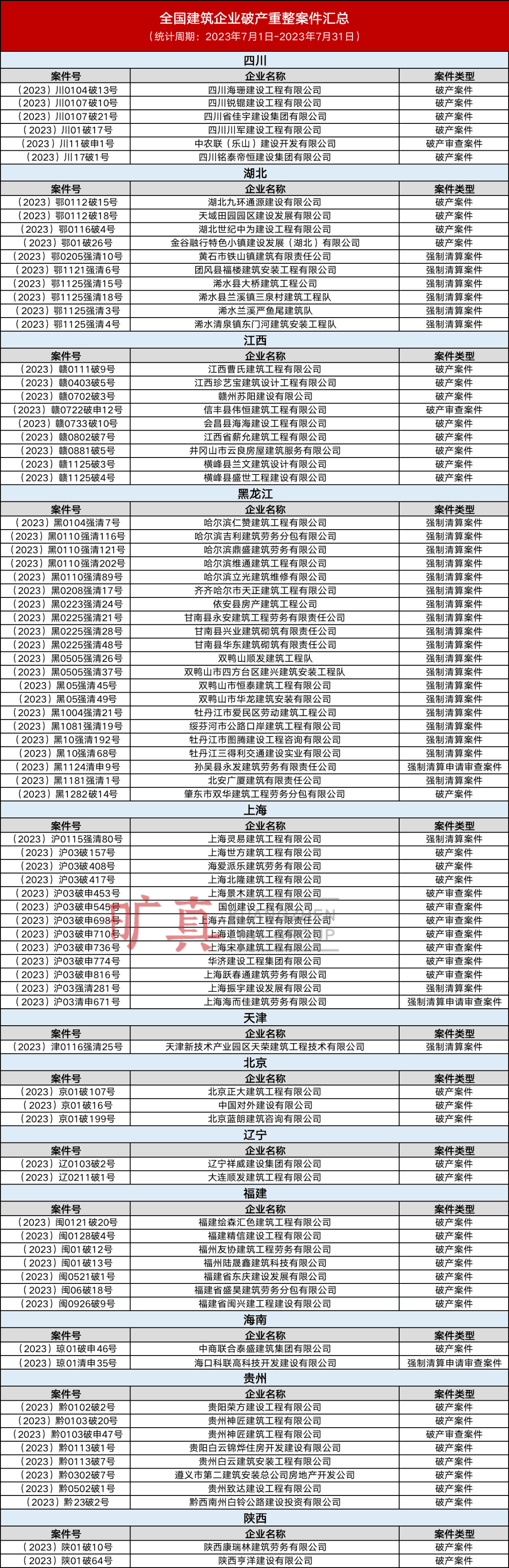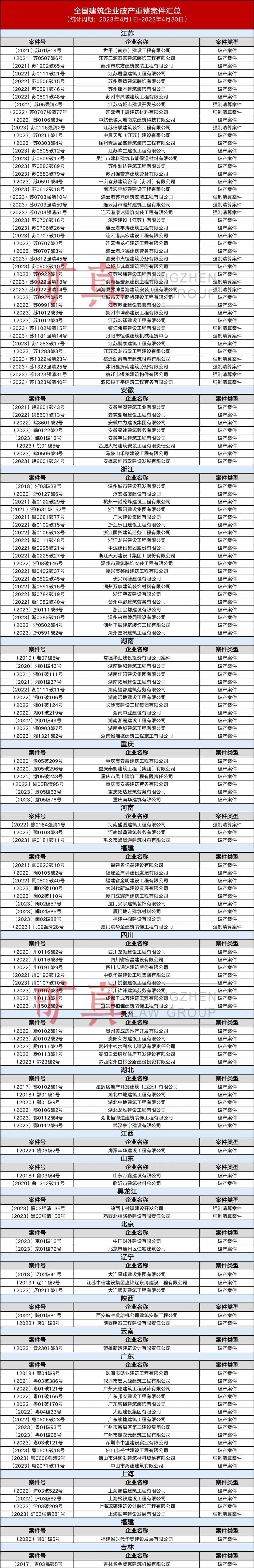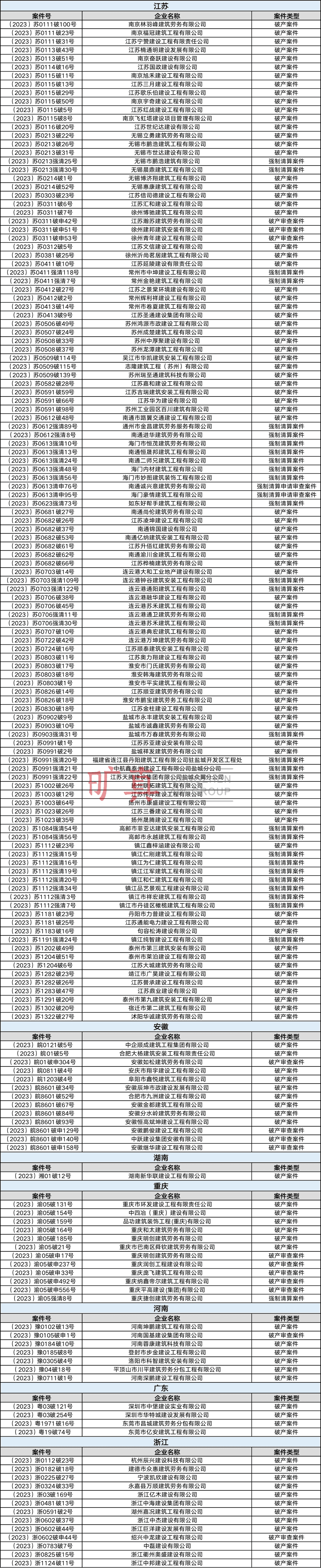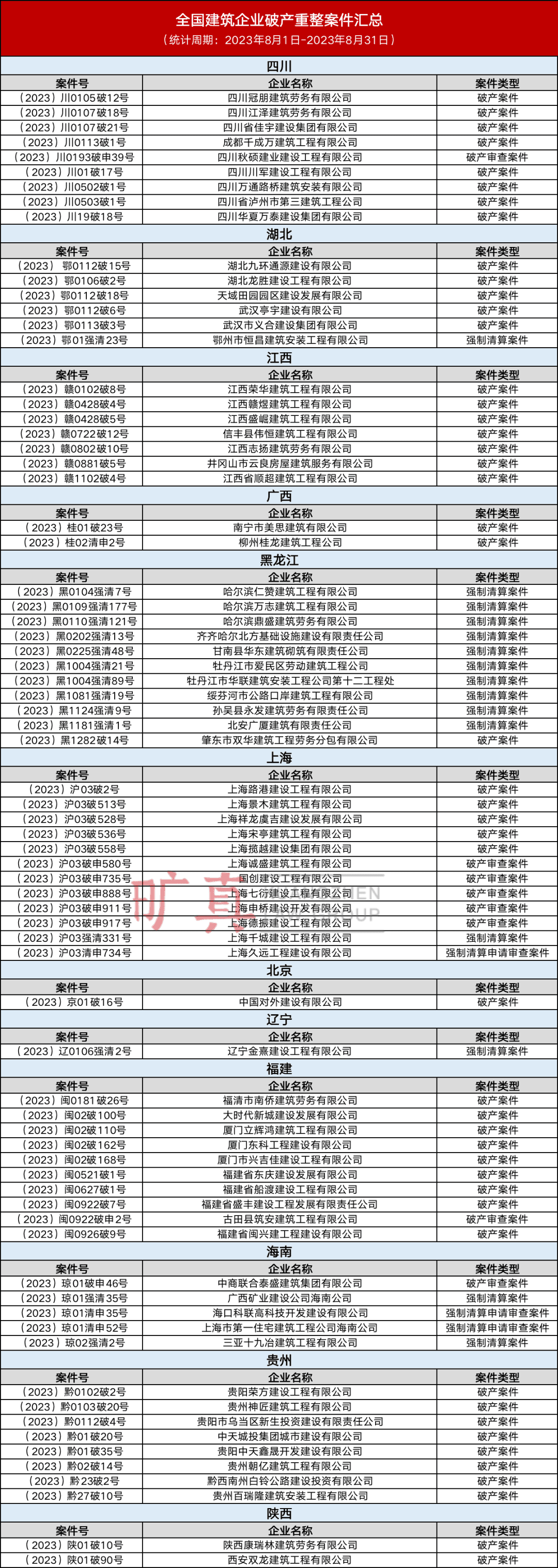 附2023年1-8月全国建筑企业破产重整案件汇总